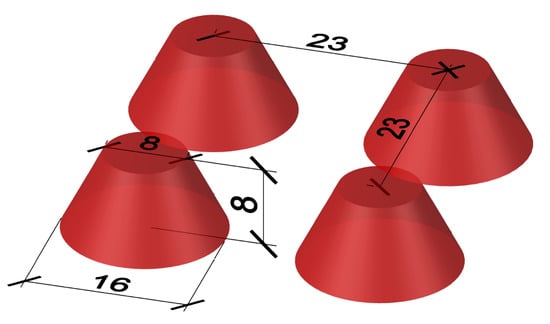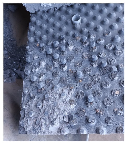 Both types of specimens were made in a total of six pieces. Three pieces of UHPC were filled with conventional concrete, and three pieces were filled with concrete where cement was partially replaced by FBC-TB. The height of the outcrops of the button foil was 8 mm, and the shape was a conical frustum with a larger diameter of 16 mm at the base and smaller at the top of 8 mm. These buttons were arranged in a square grid at an axial distance of 23 mm. These protrusions can be seen on Figure 2. The total density of the outcrops was about 1890 buttons per 1 m. The foil was placed on the formwork so that the squares were rotated by 45.