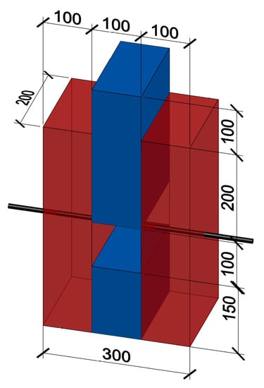 Sandwich specimen, red colour indicates UHPC, blue colour indicates NSC, grey bar is a threaded rod and the empty space between NSC parts is filled with Styrofoam.