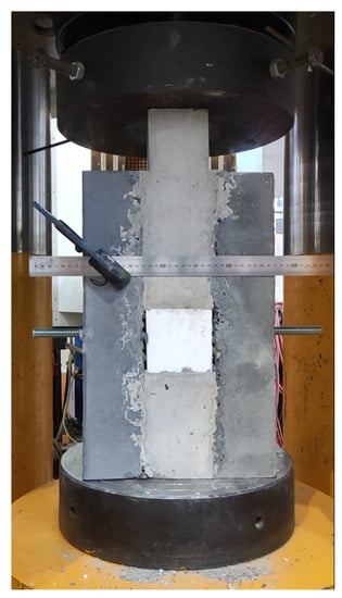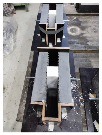 The sandwich specimens were composed of two 100 mm thick UHPC slabs. The space of 100 mm between them was filled with NSC according to [1]. The specimen was concreted in the horizontal position, which can be seen in Figure 3 and Figure 4. In order to prevent the plates from separating without achieving the shear strength of the interface, a threaded rod was inserted in the middle part. This kept the two parts of the UHPC together with no significant additional load. The nuts were not further tightened after concreting. The required distance was maintained by the embedded extruded Styrofoam. The part below the Styrofoam was also filled with NSC to prevent the UHPC elements from rotating significantly under load. The upper part (the closer one in Figure 4) protruded from the UHPC so that it could be loaded, as it can be seen in Figure 5. However, it was ensured that the filling concrete did not create a rim at the base of the protruding part that would fictitiously increase the force required to achieve the shear strength of the specimen. In this case, the area of the interface was mm.