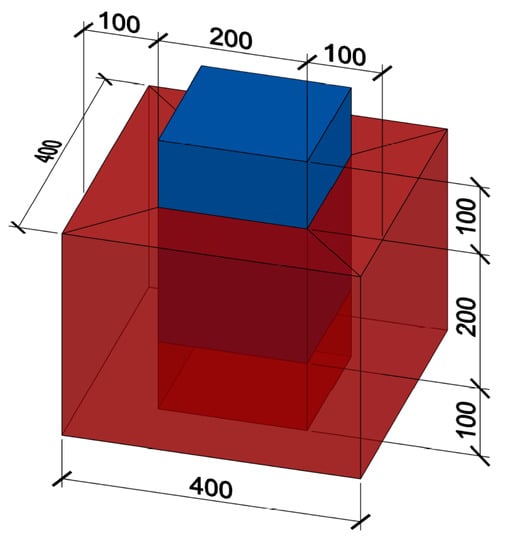 The second type of specimens for interface shear strength verification were box specimens, see Figure 6. All four inner sides of UHPC in the area of further contact with NSC were made with protrusions. Concreting was done vertically with the top protruding of NSC for an easier layout of the destruction experiment. The UHPC was reinforced with five reinforcing stirrups with a diameter of 6 mm to avoid brittle tensile failure of this outer part during destruction. Styrofoam of 100 mm height was placed at the bottom part of the box to enable vertical movements of the inner NSC part. As with the sandwich specimen, the footing of the protruding portion of the infill concrete was modified so as not to affect the measured interface shear strength. The interface area was mm.