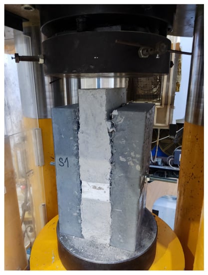 Table 3 and Table 4 show the shear strengths obtained for both types of interfaces on both types of specimens. The measured values represent the minimum shear strength reached with no stress component in the transverse direction at the interface in real structures. The sandwich samples were subjected to compression, as can be seen in Figure 8. As the Styrofoam was compressed, the crack in the upper part was opening. The test was stopped after the shear force had stabilized depending on the deformation or when the threaded rod had affected the measured value. For the mixture NSC2, the measured shear force was significantly lower than that for the mixture NSC1. An average shear strength of 3.85 MPa was measured for the NSC1 mixture. However, the average value comprised only two values as the third specimen failed. Again, the failure surface showed no evidence of cavern formation or a higher incidence of air bubbles.