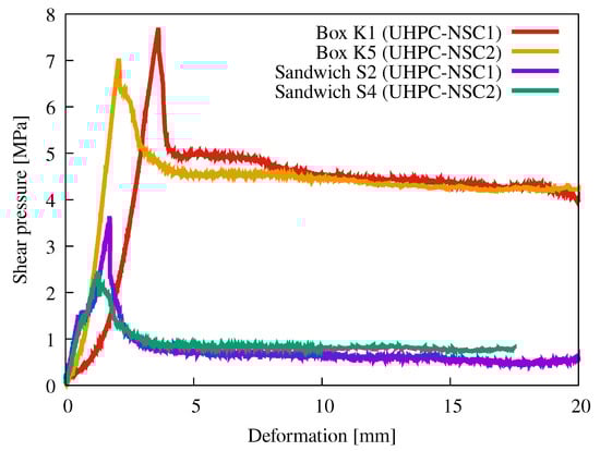 The box-type specimens with both UHPC–NSC1 and UHPC–NSC2 interfaces achieved higher shear strengths than those achieved in the study [12] by any modification of the composition of the mixtures or by surface modification or treatment. The higher shear strength was achieved only by increasing the normal load.