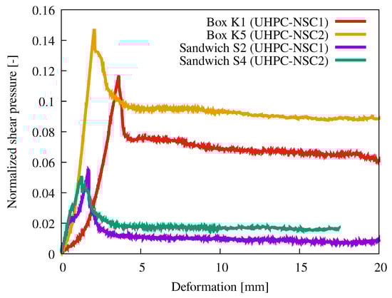 Figure 12 compares the normalized shear pressure from Figure 11 as a function of strain. It was normalized by the average value of the compressive strength of NSC measured on cubes according to Table 2. An almost identical normalized shear strength was reached for the sandwich-type specimens. The residual strength was higher in the case of the UHPC–NSC2 interface. The normalized shear strength of the UHPC–NSC2 interface for the box-type specimens was approximately 25% higher than that of the UHPC–NSC1 interface. This showed that the strength of NSC affected mainly the shear strength of the sandwich specimen interface.