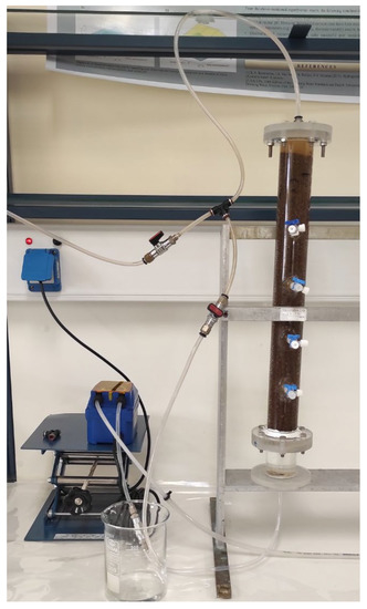 The adsorption experiments on fixed—bed reactors were conducted on Plexiglas tubes (columns) of laboratory scale (Figure 1). The tube dimensions were 40.0 cm in height and 4.0 cm internal diameter, with 450 mL operational volume, equipped with four sampling valves at various heights. The column was firstly filled with 288 g of T-Pal sample at 1.4–2.36 mm grain size and 0.67 gr cm−3 density. The removal of NH4+-N was examined using NH4Cl standard solution of 200 mg/L initial concentration which was supplied after the column was filled with the matrix. The specific concentration was selected to be comparable to previous experiments with zeolite from Kotoulas et al. [16], which were conducted at the same laboratory and equipment. The effect of continuous flow rate (15, 35, and 50 mL/min) was considered. Various samples were selected at various time intervals till the saturation of T-Pal was achieved and the breakthrough curve could be formed. Each sample was centrifuged at 5.500 rpm for 3 min and filtrated through Whatman filters (0.45 μm) to remove the finest suspended.