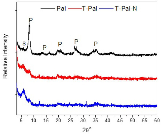 XRD patterns of raw Pal and thermally treated T-Pal samples, and T-Pal after NH4+-N adsorption (T-Pal-N). (S: saponite, P: palygorskite).