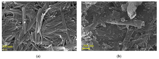 Furthermore, the fibrous morphology was verified with scanning electron microscopy (SEM). The typical fibers are depicted in Figure 3, showing fibers with lengths ranging from 250 nm to 1 μm. The effect of thermal treatment at 400 °C was significant (Figure 3a). Specifically, T-Pal fibers (Figure 3b) were strongly agglomerated (bundles) while their length decreased as a result of the total loss of coordinated water molecules [31].