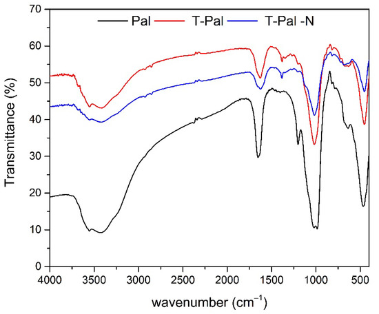 Concerning the FTIR analysis, the spectra of Pal, T-Pal, and T-Pal-N can be shown in Figure 4. At 478 cm−1, 1030 cm−1, and 1120 cm−1, typical bands of Si-O stretching were presented, whereas the bands at 985 cm−1, 1024 cm−1, and 1120 cm−1 are typical of the palygorskite [28], and the band of 1200 cm−1 is characteristic of the ribbon structure [32]. After thermal treatment, the mineralogical phase was not influenced; however, most of the bands presented decreased vibration, and a slight shifting at ~3400 cm−1 to ~3600 cm−1 that was followed and can be attributed to a partial loss of bound water after the thermal treatment. Moreover, after NH4+-N adsorption on Pal (T-Pal-N), an intense band at 1380 cm−1 can be attributed to the newly formed N-H bond, rendering the ammonium removal on T-Pal takes place [33].