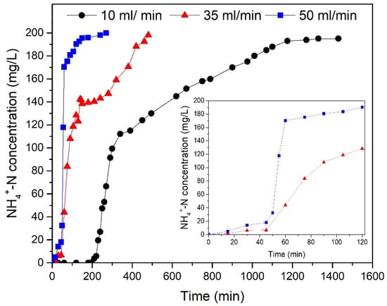 Effect of 10, 35 and 50 mL/min flow rates for NH4+-N removal (200 mg NH4+-N/L). The zoom area displays the NH4+-N removal within 120 min for flow rates 35 mL/min (red) and 50 mL/min (blue).
