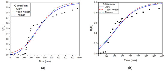 In all cases, quite high values of correlation coefficient were obtained (R2 > 0.92), highlighting those models’ sufficiency to express the NH4+-N interactions with T-Pal. Table 4 displays the calculated parameters for the above-mentioned kinetic models for all the examined flow rates, whereas Figure 6 presents the exact fit of each model. Based on the R2 values, the Clark model noted the highest ones when 10 mL/min (0.942 > 0.929) and 35 mL/min (0.902 > 0.897) were the applied flow rates. Clark’s model associates the mass-transfer concepts and Freundlich isotherm [38]. The expression of kinetics via the Clark model indicates the heterogenous nature of adsorption, which also came in agreement with the data obtained from batch experiments conducted in the previous study [11], where Freundlich isotherm was most suitable to describe the removal of NH4+-N from T-Pal. However, with the flow rate increase at 50 mL/min, Thomas and Yoon–Nelson models yield slightly better R2 values than the Clark model (0.989 > 0.987), which can be attributed to the decreased mass transfer phenomena when the flow rate increases [38,39]. This can be verifying from the Thomas or Yoon–Nelson model values, in specific the Kth or KYN, which keep increasing with the flow rate increase as well, due to the lower mass transfer resistance, as was also reported in the study by Futalan and Wan [39].