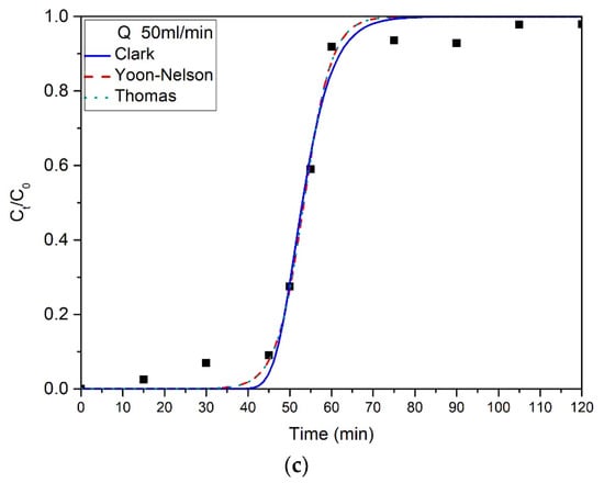 Fitting of Clark, Yoon–Nelson, and Thomas models for flow rate (a) 10 mL/min, (b) 35 mL/min, and (c) 50 mL/min.