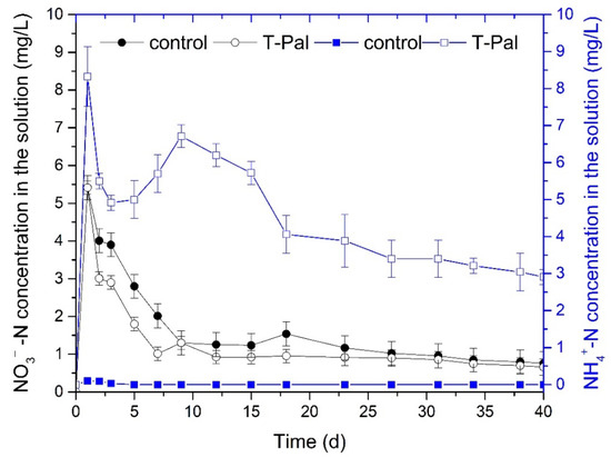 NH4+-N and NO3−-N concentrations over time in hydroponic solutions of control, and T-Pal-supplied systems for lettuce cultivation (pH: 7.1 ± 0.3, temperature: 21 °C).