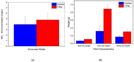 Finally, the effect of N consumption on the plants’ characteristics was significant. Specifically, the produced lettuce plants provided with both NO3−-N and NH4+-N, gained much more shoot or root weight and length compared to the control system (Table 5). The enhanced N supply was further evaluated with the ANOVA statistical analysis, verifying the synergistic effect of NO3−-N/NH4+-N on plant growth. In detail, Figure 8a,b depict the quality characteristics of plants that presented statistical differences (p < 0.05). It can be observed the lettuces derived from the system with T-Pal presented enhanced root and shoot weight than the lettuces from the control system; however, the most crucial notification was the statistical difference at NO3−-N consumption. All the measurements were evaluated via statistical analysis during the 40-day cultivation, suggesting that the gradual consumption of nitrates was found to be optimal when ammonium co-exists, despite the fact that the final consumed concentration had no significant difference.