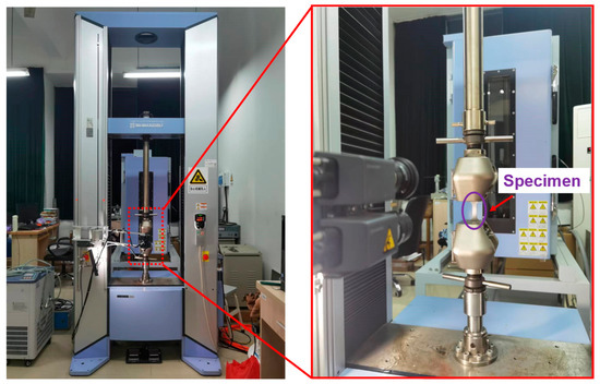 In this paper, the small punch test apparatus, modified based on the small punch creep test machine, was used to conduct SPT. Its force sensor and displacement sensor are coupled to the loading brake, and the force and displacement changes are recorded by loading the punch. Once the force is received on the force sensor, the displacement sensor begins to record the punch displacement data. This displacement sensor can be used to obtain relatively accurate displacement data of the punch on the top. The schematic diagram of the apparatus is shown in Figure 5. The apparatus for clamping the specimen consists of an upper die, and a circular lower die with a hole diameter of 4 mm. The specimen is placed horizontally and perpendicular to the direction of the force. During the test, the loading is applied to the specimen by means of a punch and a ball with a diameter of 2.5 mm. The test was conducted in a quasi-static condition with a displacement rate of 0.5 mm/min.