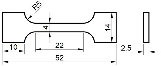 In order to obtain the mechanical properties of the materials, uniaxial tensile tests were carried out at room temperature using AG-X plus a universal electronic testing machine (SHIMADZU corp., Kyoto, Japan), as shown in Figure 2. A 52 mm × 14 mm × 2.5 mm plate-shaped tensile test specimen was used (Figure 3), and tensile tests were carried out at a strain rate of 1 × 10−3 mm/s. Finally, the yield stress (σYS), ultimate tensile strength (σUTS), and uniform elongation (ε) of three materials are presented in Table 3.
