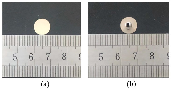 SPT specimens with a diameter of 10 mm and a thickness of 0.8 mm were cut from the plate-shaped tensile specimens after the experiment. Then, the specimens were polished to 0.55 mm on both sides by 600, 1200, and 1500 grit size papers, and finally, the specimens were finely polished to a mirror brightness of 0.5 mm by diamond lapping paste to meet the standard requirements for the surface roughness of the specimens. Figure 4 shows the macroscopic morphology of the small punch specimen before and after the experiment.