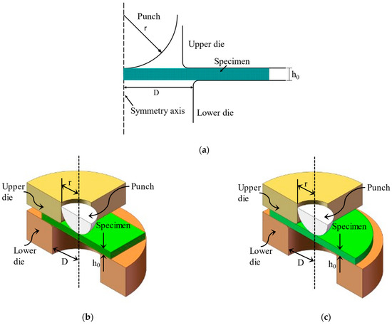 Schematic diagram of FE model of SPT. (a) 2D model; (b) 3D model with square specimen; (c) 3D model with round specimen.