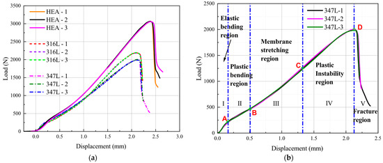 As shown in Figure 7b, The force–displacement curve can be divided into five different regions: elastic bending (region I), plastic bending (region II), membrane-stretching (region III), plastic instability (region IV), and unstable fracture (region V). However, the boundaries between these five regions are not clearly defined, and the delineation of the different regions is highly artificial. The force in the initial elastic stage (region I) and plastic stage (region II) increases almost linearly, and an obvious inflection point can be seen between the two regions. This inflection point is called the elastic–plastic transition point. The ordinate value corresponding to this point is defined as the elastic–plastic transition force or yield force (FP) (corresponding to point A in Figure 7b) by most researchers, which is usually used to correlate with the yield strength (RP) and regarded as the dividing point between region I and region II. The plastic bending region (region II) ends when the slope of the force–displacement curve increases significantly. In region III, it can be seen that the slope of the force–displacement curve gradually increases. The reason is that after the plastic bending stage, the effect of strain hardening in the material overcomes the reduction of the specimen thickness caused by the punch and enables it to bear the force at an increased rate. This situation is similar to the strain-strengthening stage of the uniaxial tensile test, and the difference is that the stress condition is a biaxial stress state. Therefore, the dividing point between region II and region III (corresponding to point B in Figure 7b) is regarded as the specimen entering the membrane-stretching stage from bending deformation.