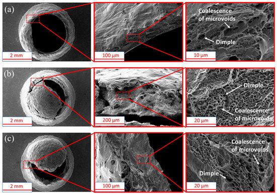 Figure 8 shows the SEM images of the three materials observed after the specimens fractured (region V). It can be observed that a large number of dimples formed in the material, and a large number of microvoids coalesced. Then, the force of the specimens begins to drop sharply, which is called an unstable fracture region (region V).