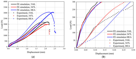 Figure 9a shows the experiment and simulation results of the three materials used in this study. When compared with the experiment results, the dividing points in the force–displacement curve of simulation are more pronounced. The general trends of the experiment and simulation responses are approximately similar in the initial four regions but different in the slopes. This deviation is more pronounced at the initial stage of the force–displacement curve, as shown in Figure 9b. The reason can be explained as that, contrary to the experiment, the specimen dies and punch are defined as rigid bodies in the simulation process, but in fact are elastic deformers. In the practical data recording, different displacement measurement methods lead to the displacement sensor at the top of the punch recording additional displacement due to the elastic deformation of the test frame [39] during the loading process, so that the displacement data recorded by the displacement sensor at the top of the punch (corresponding to SPT test) are slightly higher than the displacement data on the upper face of the specimen (corresponding to SPT simulation). The above situation leads to deviations of the force–displacement curves between the test and simulation. This deviation is also reported in literature [28,32].