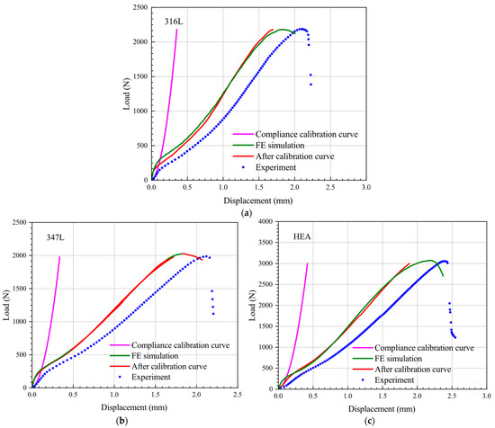 In the previous section, we analyzed and explained the reasons for the deviations between the experimental and simulation results. However, the reasonableness of the analytical results for the curves in Figure 9 needs to be further investigated by applying the compliance calibration of the loading system to the experimentally obtained force–displacement curves. It is worth noting that regarding the compliance calibration of the loading system, different compliance calibration methods are used by researchers [27,28,32,39,40,46,49]. The displacement (δupper) on the upper face of the specimen can be derived from the displacements (δext) through an appropriate correction of the respective elastic compliances involved, referred to as Cext [28,32,39,40]. Some researchers [27,43,46] believe that a linear calibration of the force–displacement (δext) response can be achieved with the compliance calibration curve obtained by this method. However, other researchers have argued that the effective contact area with the punch, the applied stress, and the strain field obtained during the SPT are neither constant nor uniform and continuously vary during the test. At the same time, as the punch displacement increases, the deformation of the specimen and the effective contact area of the material increases, and the specimen stiffness gradually increases [27]. Thus, the nonlinear calibration for the force–displacement (δext) response should be considered in the actual compliance calibration to obtain the best match between the test and simulation curves. Meanwhile, Ávila et al. [27] also pointed out that if only the initial stiffness is used to correct the original curve, a large overcorrection may be obtained for high displacement values.