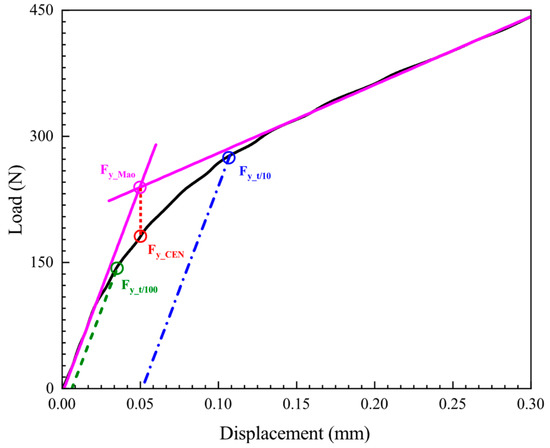 where β1 and β2 are the empirical correlation constants, h0 is the initial thickness of SPT specimen, and Fy is the elastic–plastic transition force in the SPT curve. The key to determining yield stress (σYS) lies in how to determine the corresponding characteristic force, i.e., elastic–plastic transition force (Fy). Different methods for determining Fy are proposed, as described in references [28,50]. In all the current assessments, Fy_Mao [51], Fy_CEN [22], Fy_t/10 [52], and Fy_t/100 [6] methods are adopted by most researchers, as shown in Figure 12.