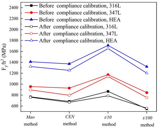 Figure 13 compares the different methods of determining the yield force (Fy) for the three materials studied in this paper. It can be seen that the difference in the methods of determining the yield force (Fy) before and after compliance correction is slight. This result indicates that the determination of the yield stress (σYS) is not affected by the loading system stiffness. It can also be seen that if the empirical correlation coefficient in Equation (8) is constant, the t/10 method obtains the highest yield strength of the material, while the other three methods obtain the yield strength of the material relatively close. However, this result was demonstrated only for the three materials studied in this paper, and its applicability to other materials remains further confirmed.