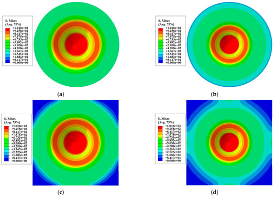 Contour plots for Von Mises stress on FE model of SPT. (a) round specimen with a diameter of 8 mm; (b) round specimen with a diameter of 10 mm; (c) square specimen with a diameter of 8 mm; (d) square specimen with a diameter of 10 mm.