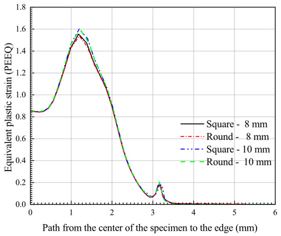 Figure 16 shows the equivalent plastic strain distribution on the bottom surface of the specimen at the maximum force in the path from the center of the specimen to the edge. Combined with the contour plots of the equivalent plastic strain distribution for specimens of different diameters and shapes in Figure 15, it can be more intuitively seen that the different specimen sizes have almost the same equivalent plastic strain distributions for the SPT deformation process.