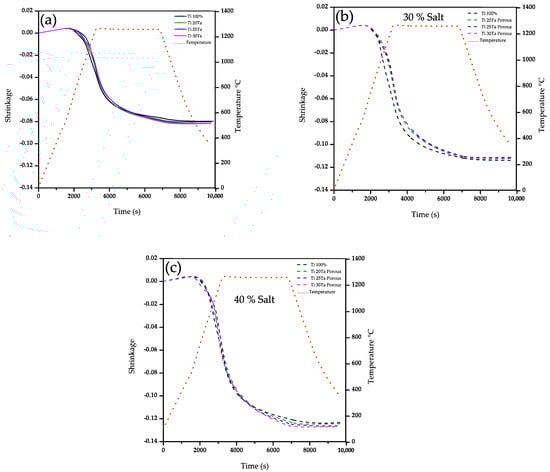 The axial strain as a function of the time and temperature during sintering of Ti and Ti-xTa compacts with and without large pores was plotted in Figure 2. All samples show an initial expansion due to the thermal expansion of the material. Next, there is a change in the slope of the strain becoming negative, which indicates the start of sintering at 613 °C. Next, there is an abrupt increase in the strain as the temperature increases until reaching the isothermal temperature, where an asymptotic behavior is observed during the sintering plateau. The maximum shrinkage reached for the Ti sample agrees with those reported by Panigrahi et al. for similar sintering conditions []. The addition of Ta in the Ti matrix generates a small increment in the shrinkage of 2.5% in comparison to that of Ti, Figure 2a. The addition of large pores enhanced the shrinkage obtained because the large pores are shrinking during sintering. It can be noticed that larger shrinkage is obtained as the volume fraction increased, Figure 2b,c. This because of the deformation of large pores induces an additional shrinkage due to densification stresses generated by sintering, as it was also reported for porous Ti6Al4V by Cabezas et al. []. Another point of view could suggest that greater contraction could be obtained because the presence of large pores improves the particle rearrangement generated by free movement of particles in the sintering process towards the periphery of these large pores as it was pointed out elsewhere [].