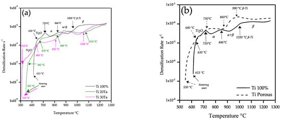 Densification rate as a function of temperature during heating up to 1260 °C of; (a) Ti and Ti-xTa; and (b) Ti without and with 30 vol.% of pore formers.