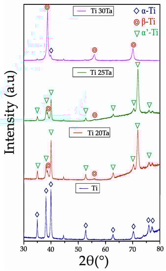 Figure 4 shows the X-ray diffraction patterns of Ti-xTa samples with 0, 20, 25 and 30 wt.% of Ta. The sample without Ta, only the characteristic peaks of the α-Ti phase are found as expected. The addition of Ta generates a change in the microstructure, first addition of 20 wt.% Ta promotes a small quantity of β-Ti phase since it can be detected in the main peak at 39.17°. It was also determined that additions of 20 and 25 wt.% Ta shows a slight displacement of the α-Ti peaks that suggest the formation of the martensite α′-Ti phase, which is also confirmed by the presence of a high peak at 72°. These characteristics were reported as an indicative of the presence of the martensite phase of titanium for other authors [,,,]. The addition of 30 wt.% of Ta generates a high increment in the intensity of the β-Ti phase characteristic peaks, being the predominant phase of the Ti30Ta alloy after sintering [].