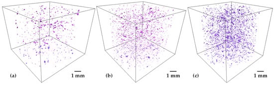 3D rendering of the remaining Ta particles after sintering for samples containing 30 vol.% of salt particles, (a) Ti20Ta; (b) Ti25Ta; and (c) Ti30Ta.