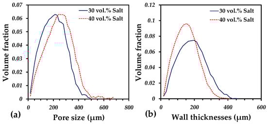 Pore size distribution (a) and wall thicknesses distribution; (b) for porous samples fabricated with 30 and 40 vol.% of salt particles.