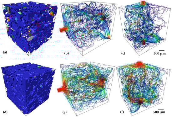 3D volume renderings of porosity, with colors depicting connected pores, and streamlines for the simulated flow of blood through the pores in the vertical and horizontal directions, with the colors depicting fluid velocity, for samples with 30 wt.% of Ta and either 30 vol.% (a–c) or 40 vol.%; (d–f) of salt particles.