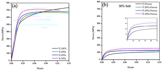 The stress-strain curves of Ti-xTa alloys with and without additional porosity sintered at 1260 °C are shown in Figure 11. It is observed that the addition of Ta into the Ti increases the yield strength from 450 MPa for Ti to 580 MPa for the alloy with 30 wt.% of Ta, Figure 11a. Comparing the behavior of the curves, it is noticed that the stress in the Ti sample increases during the plastic deformation, which indicates a plastic hardening. On the contrary, samples with Ta addition shows a maximum value of the stress during the plastic deformation and then a plateau, which indicates a more ductility in the plastic region. The mechanical properties are due to the diffusion of Ta within the Ti matrix and the stabilization of the β-Ti phase []. Although, the strength of α and β phases has been also studied, and it is reported that the β-Ti phase has a lower elastic modulus than α [,,,]. The small increment found in this work could be due to the Ta particles cannot be fully diffused into the matrix, therefore, strengthening mechanisms of the matrix could increase the mechanical strength.