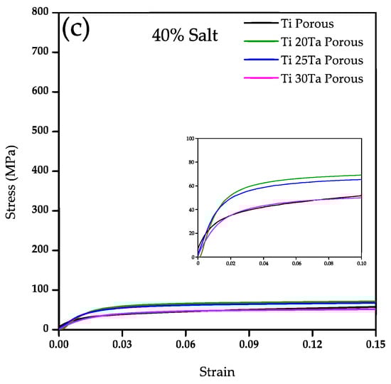 Stress-strain curves of samples sintered at 1260 °C, (a) Ti-xTa; (b) Ti-xTa with 30 vol.% of salt particles; and (c) Ti-xTa with 40 vol.% of salt particles.