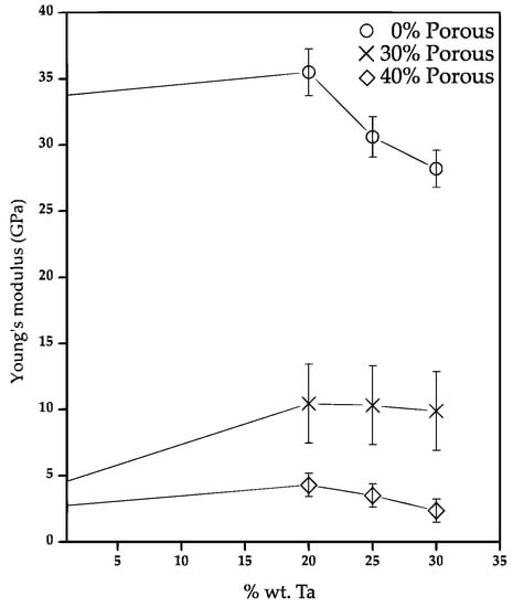 Young’s modulus as a function of the weight% of Ta for samples with and without additional porosity added.