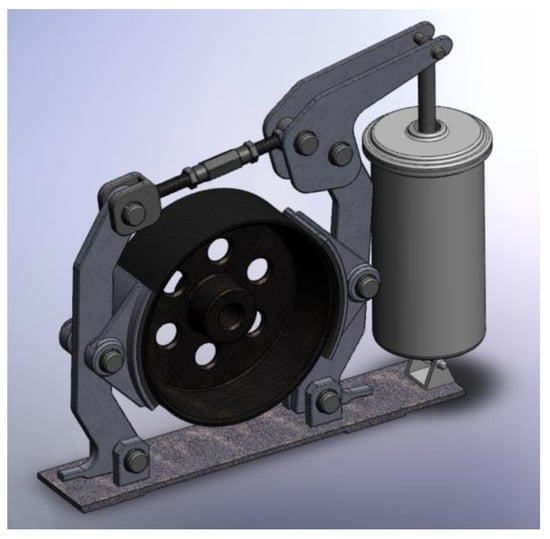 In this study, the brake shoes of the following type-dimensions were tribologically analyzed: brake type FC 200, brake type FC 315, and brake type FC 400 [], manufactured at U.M.T. Timisoara Romania. Figure 3 shows the model of a brake type FC 400. The drum of these brakes is made of steel, and the brake shoes are covered with brake linings of composite materials type FF-30. FF-30 is environmentally friendly, with good wear resistance, a good friction characteristic and a good mechanical strength []. Under these conditions, the operational parameters specific to these types of brakes that form a part of overhead cranes were taken into account for the experiments.