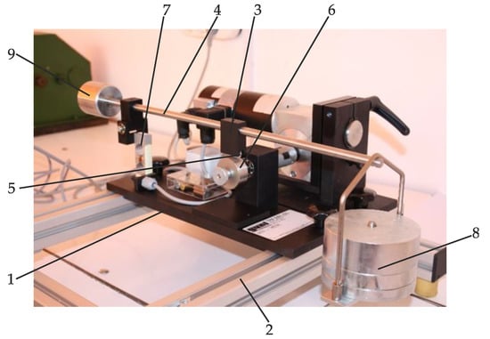 The principle of operation and the component parts of the stand are presented in Figure 5. The module board (1), of the basic unit (2), the assay sample holder (3) adjusted and fastened on the loading arm (4). The loading arm (4) makes it possible to obtain a transmission ratio of 2:1. The scope of supply includes assay sample (5) made of three different materials. The friction wheel (6) is made of hardened stainless steel. Its surface is polished. The force transducer (7) is used to measure the friction. The set of weights (8) is used to adjust the load gradually. The counterweight (9) compensates for the unloaded weight of the loading arm (4).