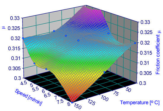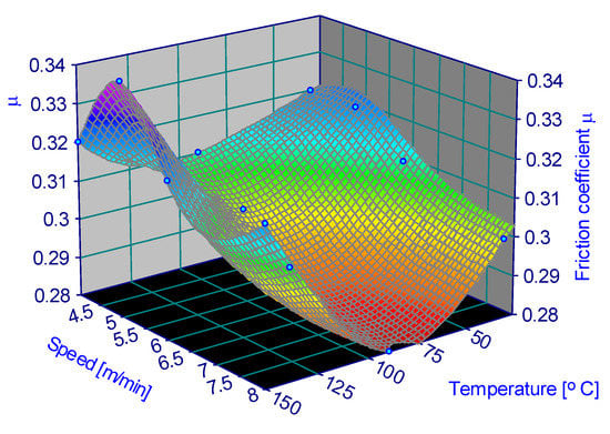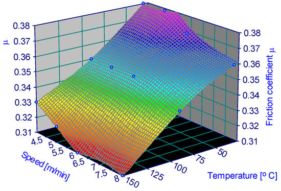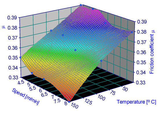 If these results are compared with other studies carried out in the field, it is found that the variation in the coefficient of friction with temperature, speed, and pressure, for the studied interval, is similar [,].