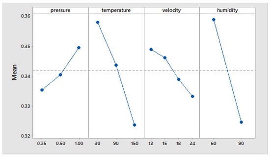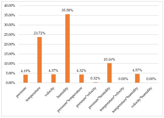 Regarding the interactions between factors, the highest value has a pressure–humidity interaction with a value of 10.89%, followed by temperature–humidity with 7.28% and pressure–temperature with a value of 5.55%. Temperature–velocity and velocity–humidity interactions have an insignificant influence.