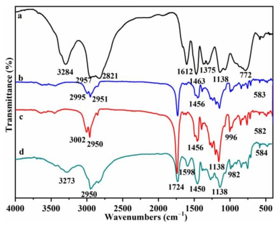 Figure 1 displays the FTIR spectra of the PEI, magnetic PMMA, magnetic PMMA-PGMA and PMMA-PGMA-PEI. For the Fe3O4 nanoparticles, an Fe-O stretching vibration was usually present at 581 cm−1 []. For the PEI, the absorption band included at 3284 cm−1 was attributed to a N-H stretching vibration. In the magnetic PMMA microspheres’ spectrum, a new band representing carbonyl stretching appeared at 1724 cm−1 []. Besides this, bands of C-H stretching vibrations at 2821 cm−1 and C-H bending vibrations at 1375 cm−1 and 1463 cm−1 appeared. Compared to the magnetic PMMA microspheres’ spectrum, the characteristic absorption peaks of the magnetic PMMA-PGMA were the epoxy vibration absorption at 996 cm−1 and the band at 1724 cm−1 (O-C=O stretching), which became stronger in intensity—providing evidence for the graft copolymerization of GMA on the magnetic PMMA microspheres. The disappearance of the epoxy vibration peaks and the N-H vibration absorption at 1598 cm−1 confirmed that the magnetic PMMA-PGMA microspheres were successfully modified with PEI [].
