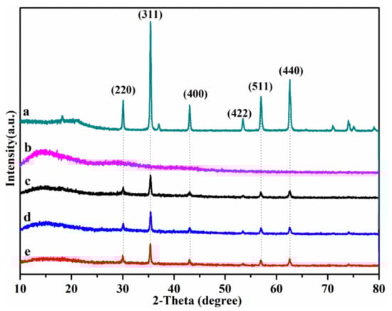 XRD patterns of (a) Fe3O4 nanoparticles; (b) PMMA; (c) magnetic PMMA; (d) magnetic PMMA-PGMA and (e) magnetic PMMA-PGMA-PEI.