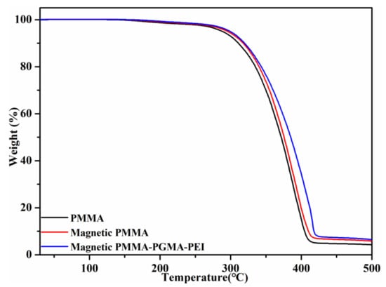 TG curves of PMMA, magnetic PMMA and magnetic PMMA-PGMA-PEI.