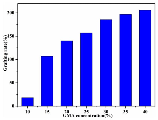 Different GMA concentrations were investigated to achieve the optimal adsorption efficiency. The effect of GMA concentration on GY was investigated at an absorbed dosage of 200 kGy (Figure 5). The GY increased to its maximum until the concentration of GMA was at 40 wt%. Furthermore, considering various factors, a concentration of 40 wt% GMA and a grafting rate of 206.18% were considered the best conditions for preparing magnetic PMMA-PGMA.