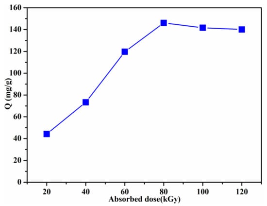 As shown in Figure 6, the adsorbing capacity increased substantially with increases in the irradiation dose up to a dose of 80 kGy, at which point the adsorbing capacity reached its maximum. However, when the irradiation dose increased further, the adsorbing capacity decreased slightly.