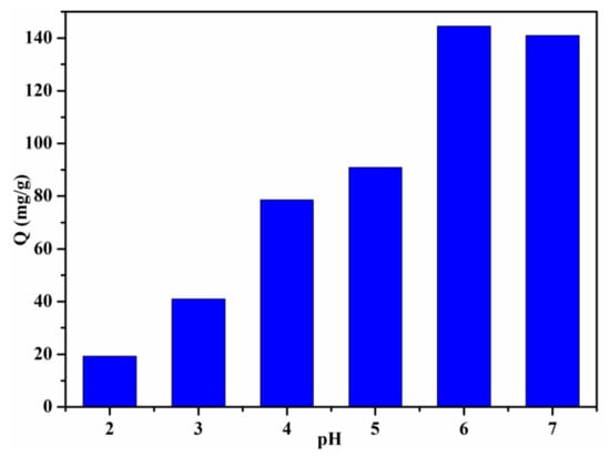 pH is regarded as one of the most important factors for the adsorption process of water-adsorbent interfaces as the pH influences the physicochemical behavior of an aqueous medium and especially its adsorption capacity. The effect of the pH on the percentage of adsorption of the Ce(III) solution at equilibrium was investigated in the range of 2.0–7.0 at 298.15 K. As observed from Figure 7, the uptake of Ce(III) was highly dependent on the pH value. Under strong acidic conditions, the sorption progressively increased with pHs between 2 and 3; this may be caused by the PEI groups being in the protonated form, and thus, the amount of adsorbed Ce(III) being very limited. As the pH increased from 3 to 6, the uptake capacity increased dramatically. This may be attributed to the functional PEI groups being deprotonated; thus, the number of electrostatic and ionic interactions increased. After the optimum pH, the amount of adsorbed Ce(III) no longer increased as the pH increased, which can be ascribed to the generation of metal precipitation and the formation of REE hydroxo colloids []. Combined with the above factors, pH = 6.0 was chosen as the optimum condition for the uptake of Ce(III).
