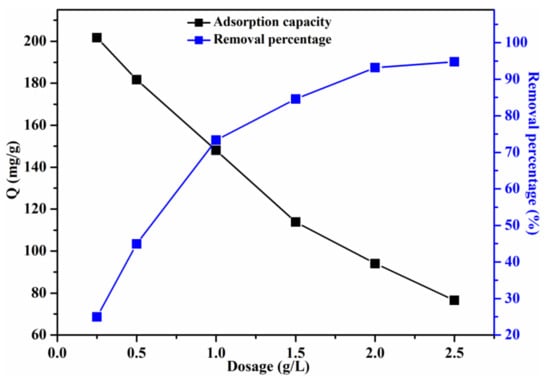 Effect of dosage on adsorption capacity and removal percentage (Adsorbed dose = 80 kGy, dose rate = 20 kGy/pass, GMA concentration = 40 wt%, contact time = 24 h, pH = 6, C0 = 200 mg/L, T = 298.15 K).