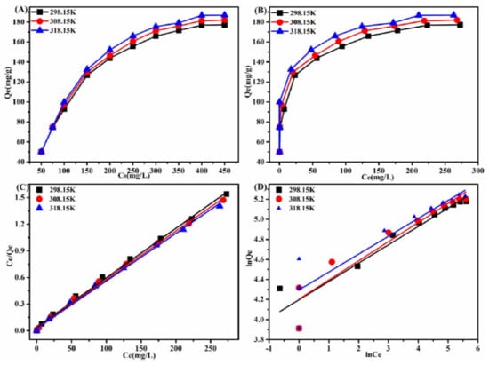 To investigate the relationship between the initial Ce(III) solution concentration and the adsorption capacity at various temperatures, the adsorption isotherms were studied. Adsorption isotherms were conducted at three temperatures (298.15, 308.15, 318.15 K) with diverse initial Ce(III) concentrations (50–450 mg·L−1). The mixed sample was shaken for 24 h to ensure adsorption equilibrium. Langmuir [] as well as Freundlich models [] were used to investigate the adsorption isotherms, as follows: