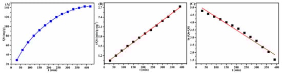 As shown in Figure 10A, the adsorption capacity gradually increased with the prolongation of time, and the adsorption equilibrium was basically reached at 360 min at 298.15 K.